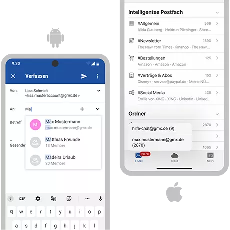 Ob Sie Android oder iOS als Betriebssystem nutzen, die GMX Mail App bietet Ihnen immer höchtsten Komfort für unterwegs: Einfaches und komfortables Lesen und Schreiben von E-Mails, Zugang zu Ihrer Cloud und Ihren Fotos, die wichtigsten News des Tages und – optional – gesicherten Zugang dank PIN-Schutz.